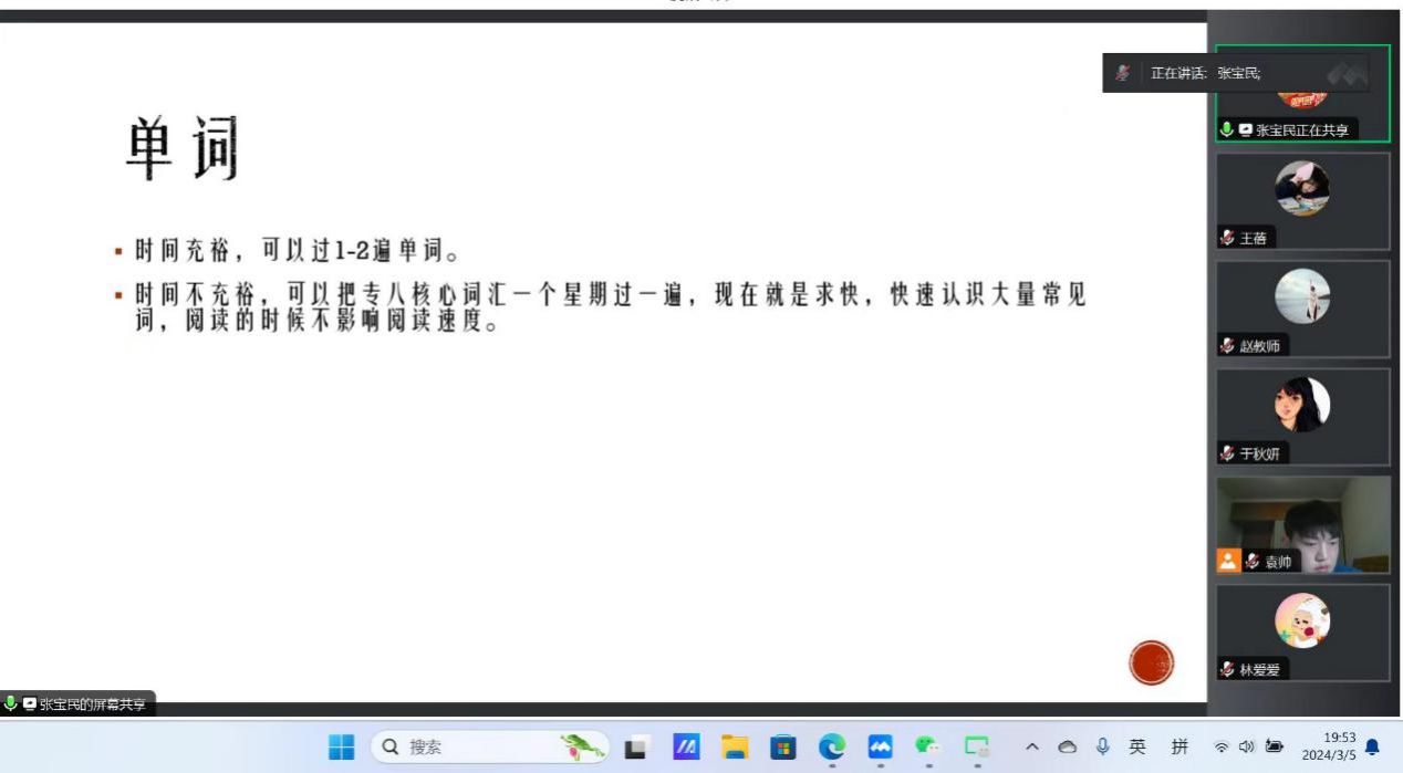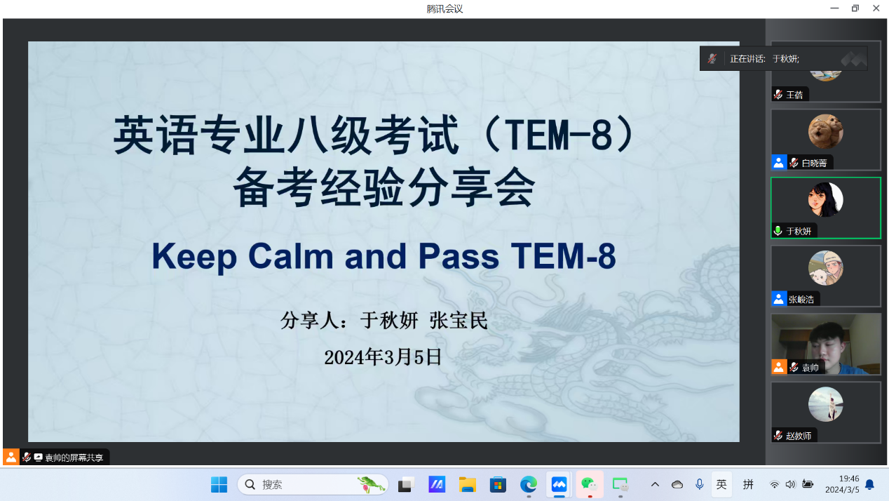 举办专八经验备考分享会我们请到了2022届商务英语专业毕业生于秋妍2023届英语专业毕业生张宝明两名同学都是当年的研究生保送学生。两名同学分别从专八考试的题型专八单词准备及应对方法入手,详细梳理了每种题型的注意事项,强调练习的重要性还为同学们解答了备考过程中出现的问题。