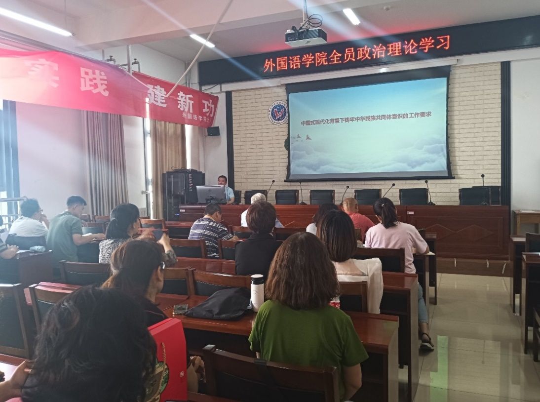 2024年6月13日下午,外国语学院在明德楼A205会议室组织全体教职工进行政治理论学习。邀请了马克思主义学院教授冯大彪进行了题为《中国式现代化背景下铸牢中华民族共同体意识的工作要求》的讲座。