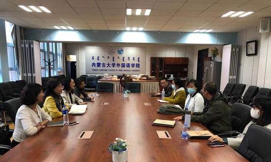 ,刘瑾玉副院长及院系主要负责人分享了内大外院在专业建设、硕士点建设、科研教研及大学英语教学等方面的主要经验,双方也分别就英语专业的分方向教学、学分安排、课程设置,以及大学英语的分级教学等内容展开探讨,分享教学经验。