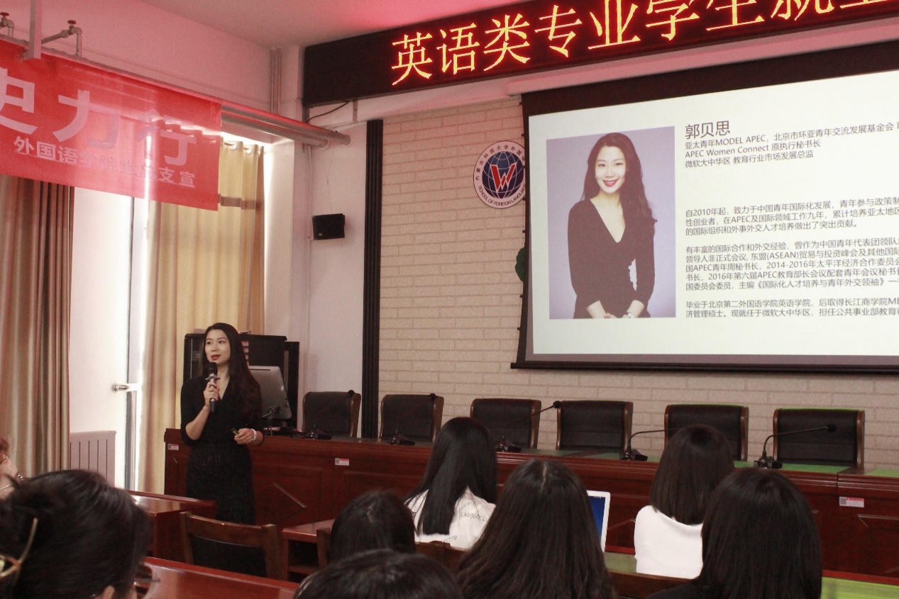 本场讲座邀请到了微软(中国)有限公司的行业发展总监郭贝思主讲,第一讲聚焦英语类专业学生就业对口的典型岗位,分析学生应具备的能力;第二课讲解简历撰写的技巧,帮助学生完善简历,提前进行求职准备。