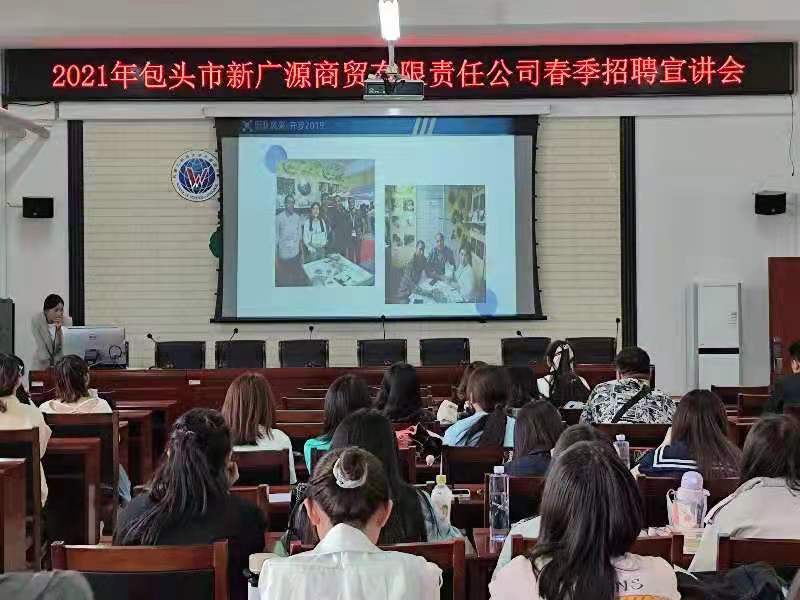 充分发挥校友资源,联系包头市新广源商贸有限责任公司开展招聘会,为广大毕业生提供高质量的就业机会。