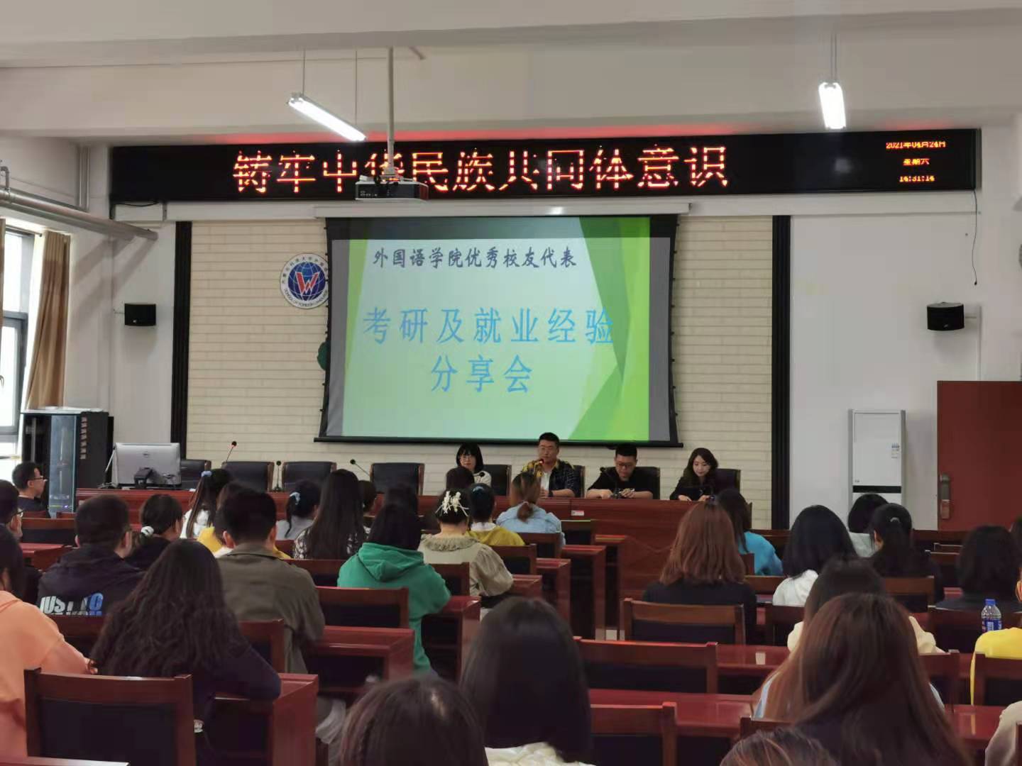 座谈会后,2019届校友戚新光、2020届校友史黎明、王晓宇和付天宇四位优秀校友在学院A205会议室为大三和大四两个年级的学弟学妹们分享了他们考研深造或者就业工作的经历和经验。